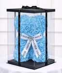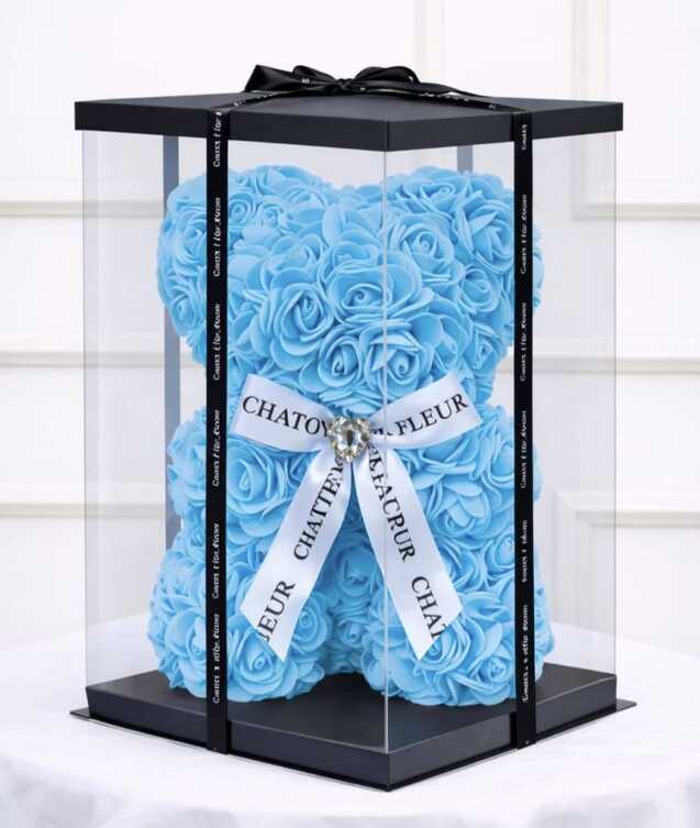 Ursulet 23 cm din trandafiri rosii de spuma cu funda alba,ambalati in cutie transparenta