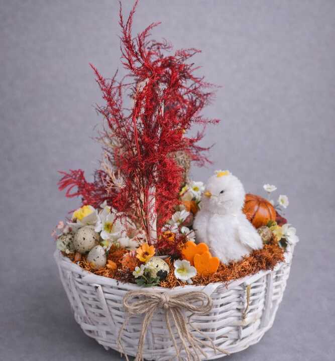 Contine 2 trandafiri, 2 gerbera, 3 fresia, 3 garofite,1 crin, verdeata