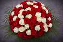 Buchetul contine 60 trandafiri rosii,41 trandafiri albi,frunze de palmier,funda