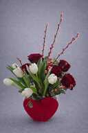 Cutie in forma de inima cu 6 lalele albe,5 trandafiri rosii,3 matisori rosii,eucalipt