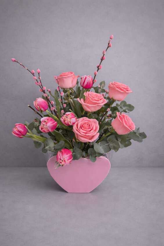 Aranjament in cutie roz cu 6 lalele roz,5 trandafiri roz,3 matisori roz,eucalipt