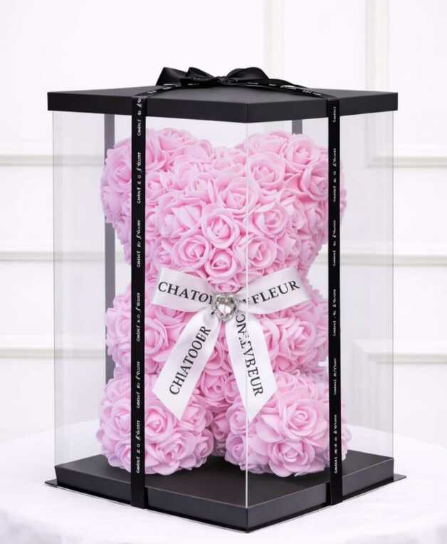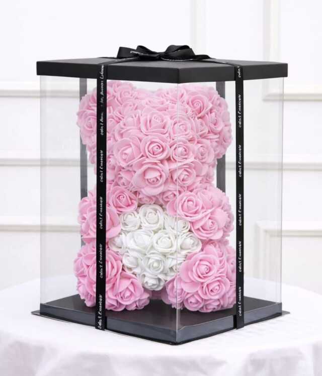 Ursulet 23 cm din trandafiri de spuma roz deschis cu funda alba,ambalat in cutie transparenta