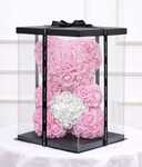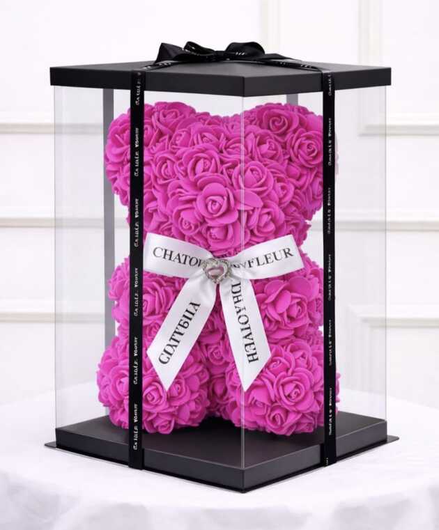 Ursulet 23 cm din trandafiri de spuma fuchsia cu funda alba,in cutie decorativa transparenta