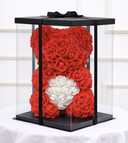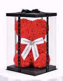 Ursulet 23 cm din trandafiri rosii de spuma cu funda alba,ambalati in cutie transparenta