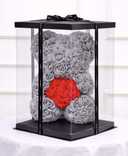 Ursulet 23 cm din trandafiri de spuma gri cu inima din trandafiri de spuma rosii,in cutie decorativa transparenta