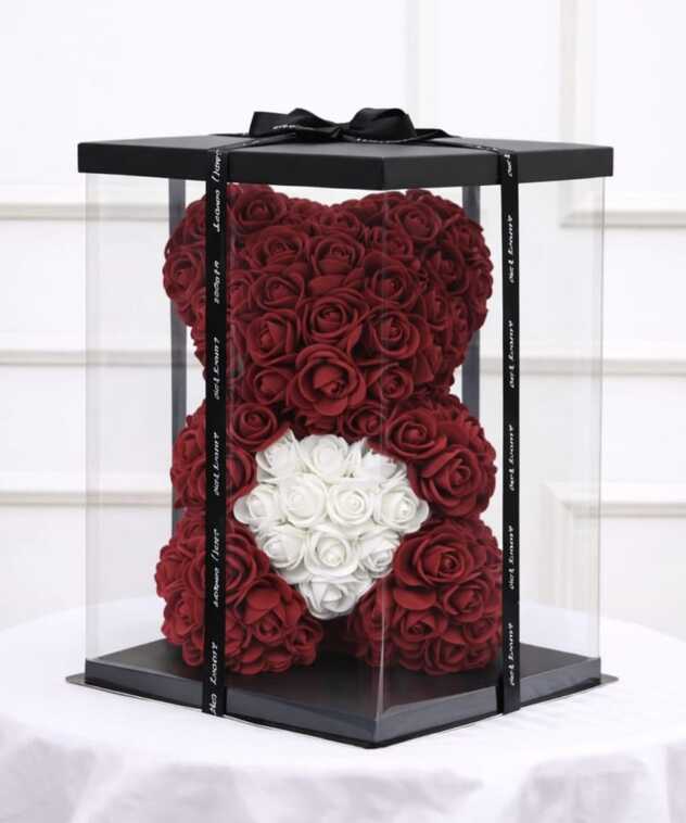 Ursulet 23 cm din trandafiri de spuma bordo cu inima din trandafiri albi de spuma,ambalaj decorativ transparent