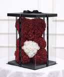 Ursulet 23 cm rosu cu trandafiri de spuma si inima din trandafiri albi din spuma in cutie decorativa transparenta