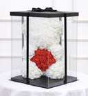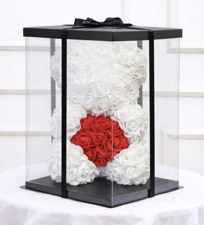 Ursulet 23 cm din trandafiri albi de spuma cu inima din trandafiri rosii,ambalat in cutie transparenta decorativa