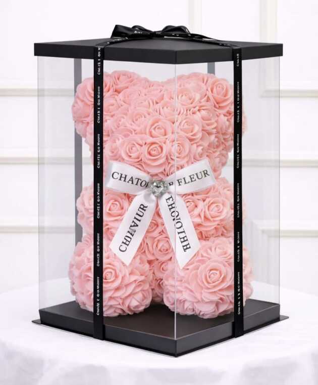 Ursulet din trandafiri de spuma roz pudra cu funda alba in cutie transparenta